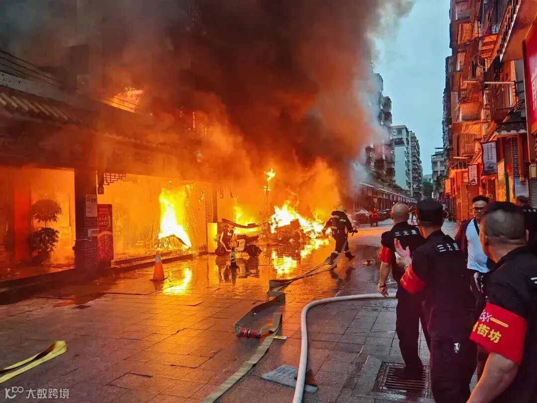 5月10日广州白云区三元里村抗英大街52号室外电动车发生火灾,接警后消防救援人员立即赶赴现场处置,据悉着火现场为室外电动车自燃并引燃,未造成人员伤亡,此次火灾燃烧面积约20平方米,火灾波及旁边停放的电动车和4间店铺的门面共烧毁25辆电动自行车,所幸电动车停放位置距建筑物较远未严重影响到商家店铺以及二楼的居民楼。
