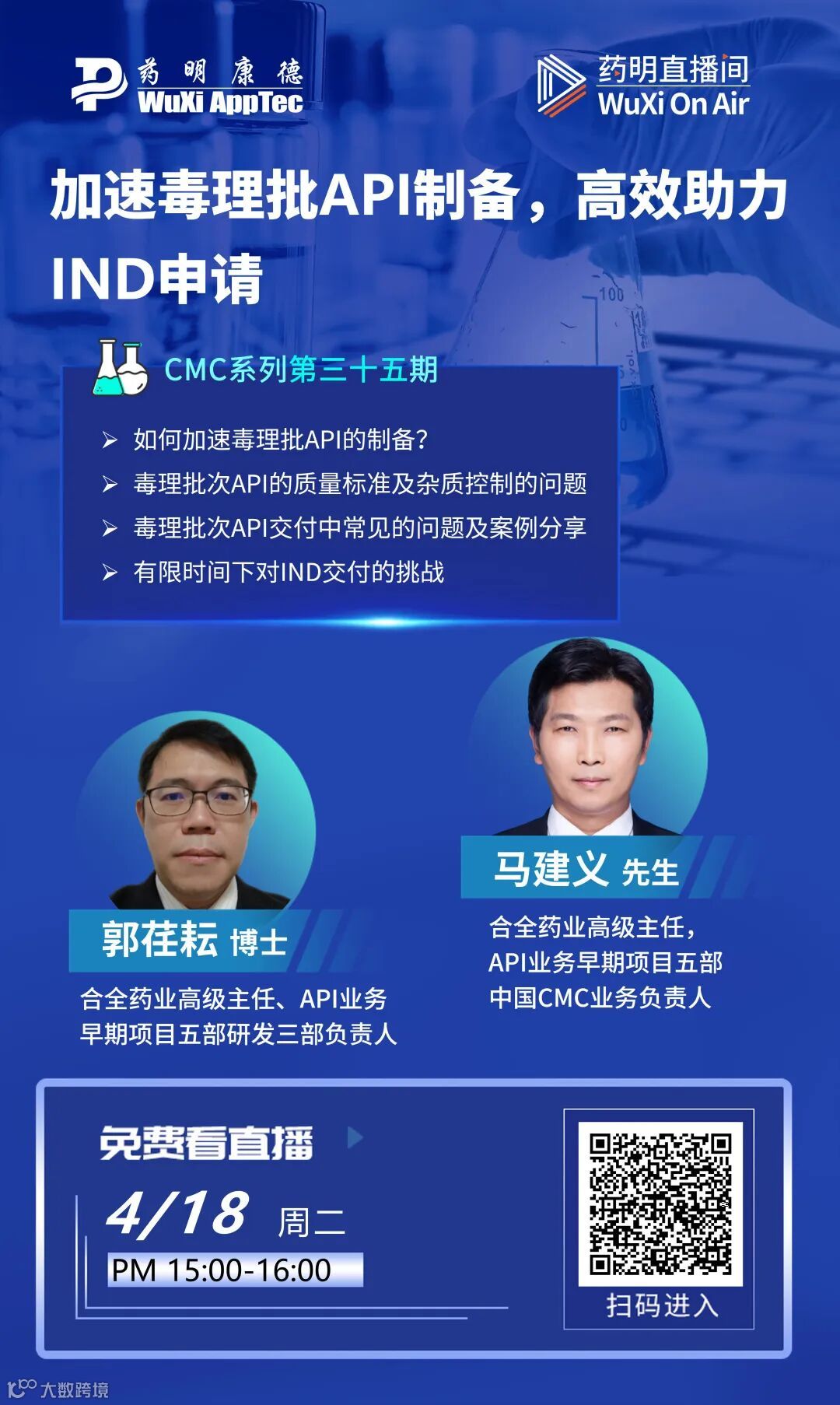 4月18日15:00-16:00,合全药业高级主任、API业务早期项目五部研发三部负责人郭荏耘博士,以及合全药业高级主任、API业务早期项目五部中国CMC业务部负责人马建义先生,将聚焦毒理批次API快速交付产生的价值及意义,以及在IND申请阶段所面临的不同的CMC挑战展开经验分享,如工艺放大可行性、安全评估、晶型控制、杂质残留等。此外,讲者将围绕合全药业相关真实案例展开细致介绍,欢迎注册本次直播。