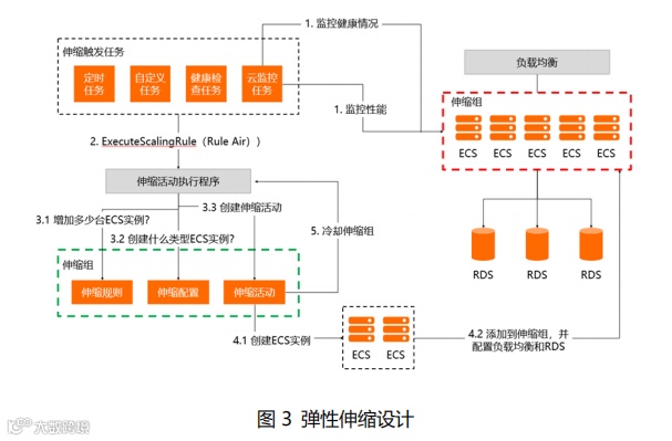 弹性伸缩方面,需要能够根据用户的需求和策略,自动调整计算资源的大小。混合云平台的监控模块将实时监控伸缩组内实例的性能和健康状况,一旦业务量上升,实例性能达到某一阈值,便按照预先配置的伸缩任务和规则在公有云上创建和部署新的实例。规则的内容将包括实例的数量、类型以及配置等。之后随着业务量下降,伸缩组也可以根据监控信息,弹性的减少实例。