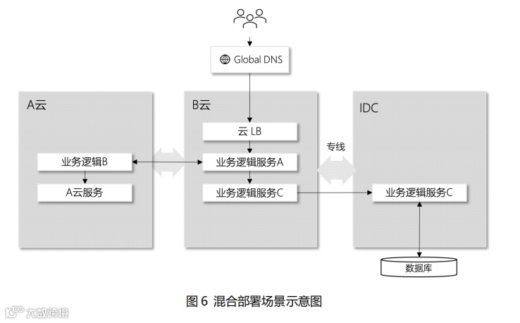常见的混合部署形态为,将敏感数据层和对数据延时有高要求的业务模块放在 IDC,将应用接入层、应用逻辑层放在公有云就近地域。与此同时,应用的一些依赖服务、或者上下游服务可以部署在另一个云厂商公有云。多个数据中心通过专线连接,内网访问,以保障安全性和网络稳定性。
