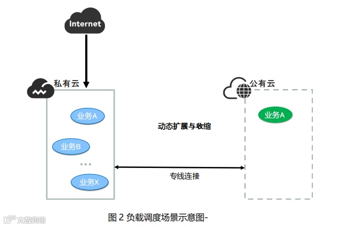 负载调度场景下采用混合云架构的根本目的是在满足快速变化的业务需求的基础上实现成本的优化。因此,通常会将应用部署在私有云里,仅维持满足日常服务需求的算力。当遇到某一特定时期应用访问或使用突然增加,而企业无法快速添置硬件扩展私有云容量去适应这变化时,混合云平台可以通过公有云来弥补暂时的容量不足,达到调峰目的。