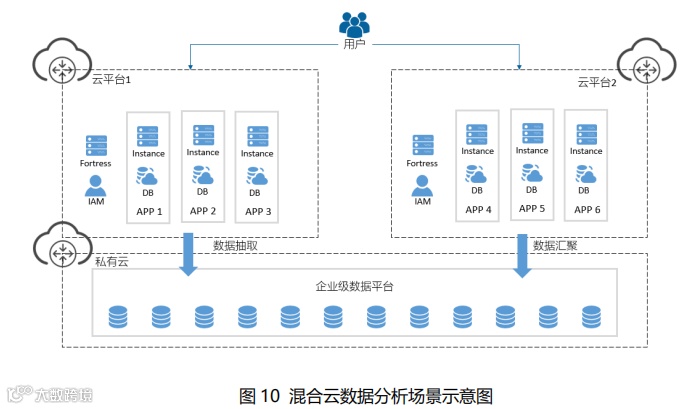 在整体架构中,通过不同云平台的业务数据可通过主动抽取和汇聚导入的方式,集合到一个可控的数据云平台,此平台可以在公有云或私有云环境中,但鉴于企业对于数据安全和合规的要求,建议使用私有云环境作为数据云平台。