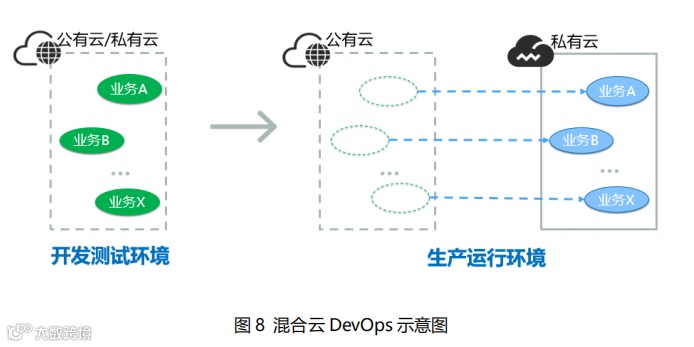 实际部署中,可以将业务的开发测试环境及开发云资源池部署在公共云上,利用公有云按需使用和快速部署能力满足开发测试过程中不断变化的需求;与此同时,用户的核心业务和关键系统生产环境及生产云资源池则可以部署在私有云上,保障业务的稳定的运行。
