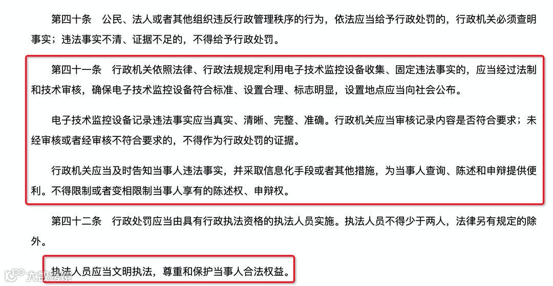 其中第四十一条规定:行政机关依照法律、行政法规规定利用电子技术监控设备收集、固定违法事实的,应当经过法制和技术审核,确保电子技术监控设备符合标准、设置合理、标志明显,设置地点应当向社会公布。