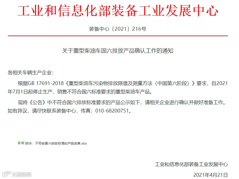 日前,工业和信息化部装备工业发展中心网站发布《关于重型柴油车国六排放产品确认工作的通知》,通知明确自2021年7月1日起停止生产、销售不符合国六标准要求的重型柴油车产品。