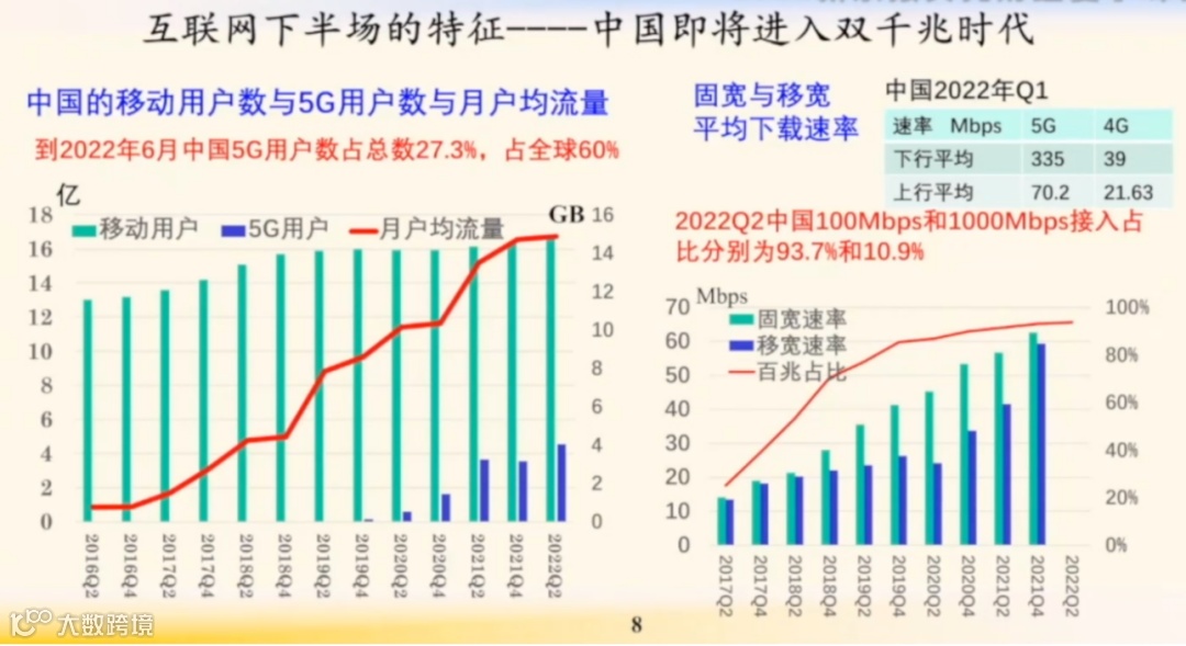 互联网下半场还有一个特征是,中国即将进入双千兆时代。中国的移动用户数已经超过14亿了。中国的5G用户数到今年6月份,占全部移动用户数的27.3%。我们每个移动用户每个月的户均流量是逐年递增,到现在我们每个月每户超过了14GB。
