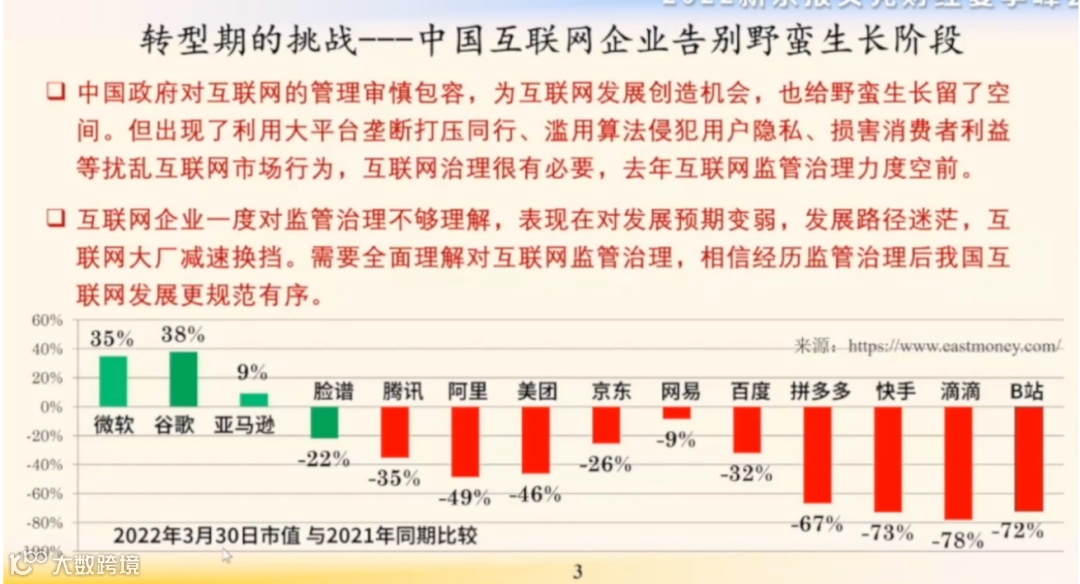 所以互联网的治理很有必要。去年国家出台的互联网监管治理力度是空前的。互联网企业一度对监管不够理解,表现在对发展预期变弱、发展路径迷茫、互联网大厂减速换挡。