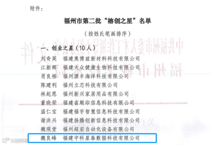 12月5日,中共福州市委人才工作领导小组办公室、福州市科学技术局联合发布福州市第三批“榕创之星”入选名单,经过组织申报、形式审查、专家评审、实地考察、部门联审等遴选流程,福建中科星泰数据科技有限公司董事长魏良峰荣获“创业之星”人才称号。