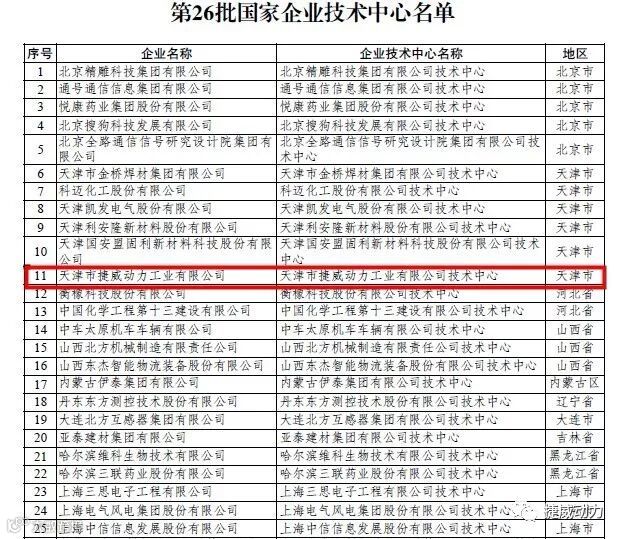 近日,国家发展改革委会同科技部、财政部、海关总署、税务总局等部门,联合公布了《2019年(第26批)新认定国家企业技术中心名单》,确认122家企业技术中心、14家分中心获得国家企业技术中心及分中心资格。天津市捷威动力工业有限公司成功入选,标志着公司的研发水平已经进入国家队行列。