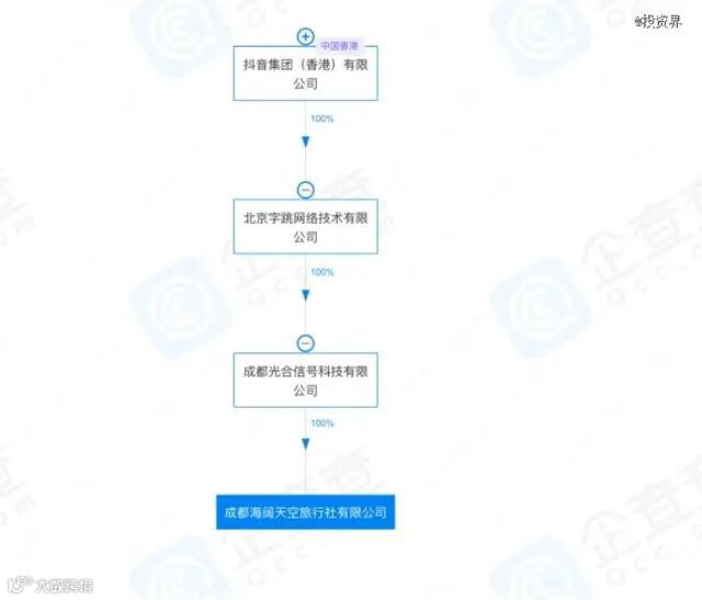 7月28日讯,天眼查App显示,近日,成都海阔天空旅行社有限公司成立,法定代表人为张凌,注册资本100万人民币,经营范围含旅游业务、票务代理服务、旅客票务代理、软件开发、旅游开发项目策划咨询等。股权全景穿透图显示,该公司为成都光合信号科技有限公司全资子公司,后者由抖音集团(香港)有限公司间接全资持股。(亿欧)