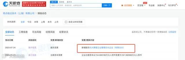 继7月17日领投AR眼镜公司致敬未知天使轮融资后,阿里再次加码AR。天眼查数据显示,近日,奇点临近技术(上海)有限公司(简称“奇点临近”)发生工商变更,股东新增阿里旗下杭州灏星企业管理合伙企业(有限合伙),注册资本增至约167.4万元。奇点临近成立于2021年12月,是一家以全天候智能眼镜为核心方向的科技创新创业企业,其创始人吴德周曾担任华为荣耀产品线总经理。
