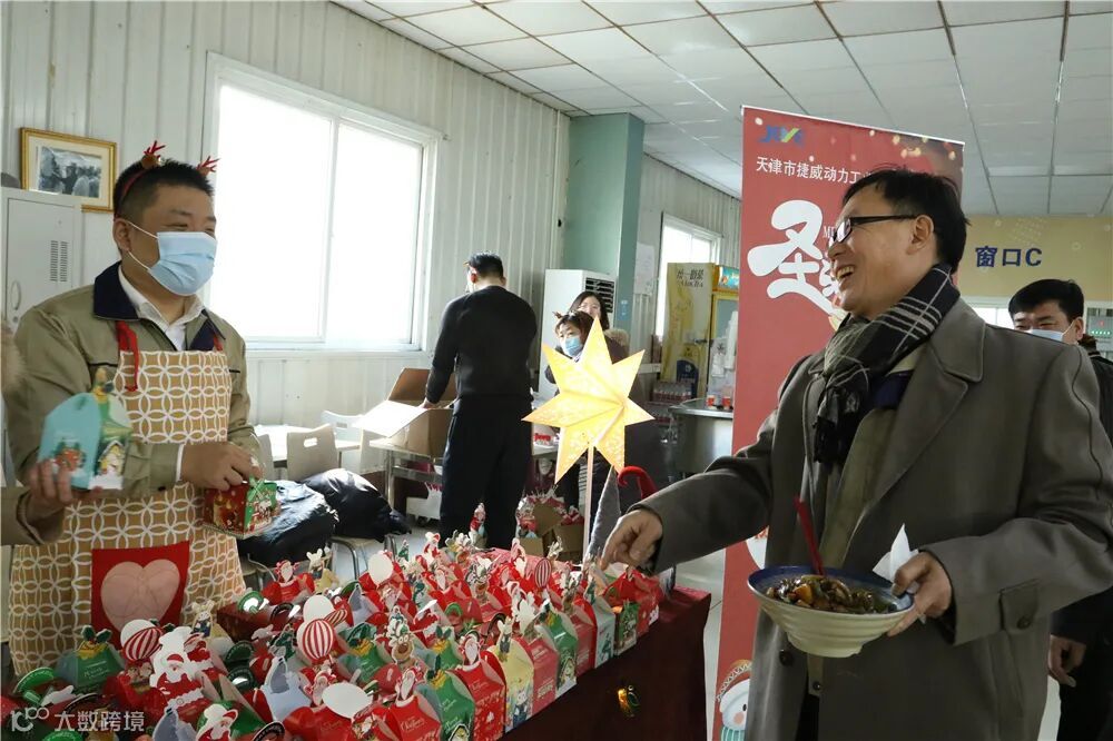 总部及天津基地、嘉兴基地、盐城基地同频互动,步调一致,不仅为午餐加料,圣诞的心意也是满满的——捷威一家亲,让每一个节日都充满爱意,充满仪式感的圣诞节在捷威。