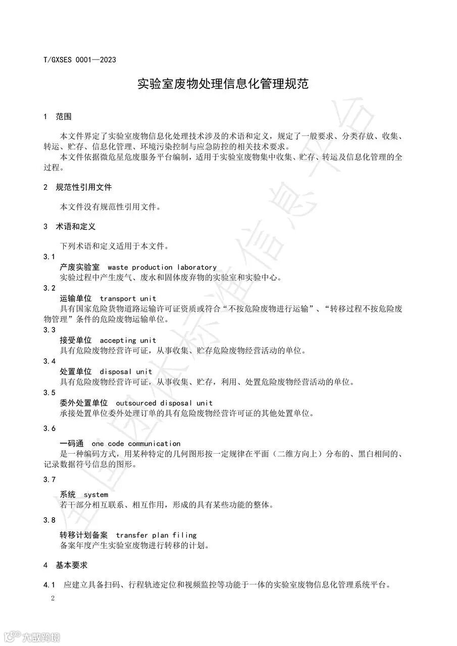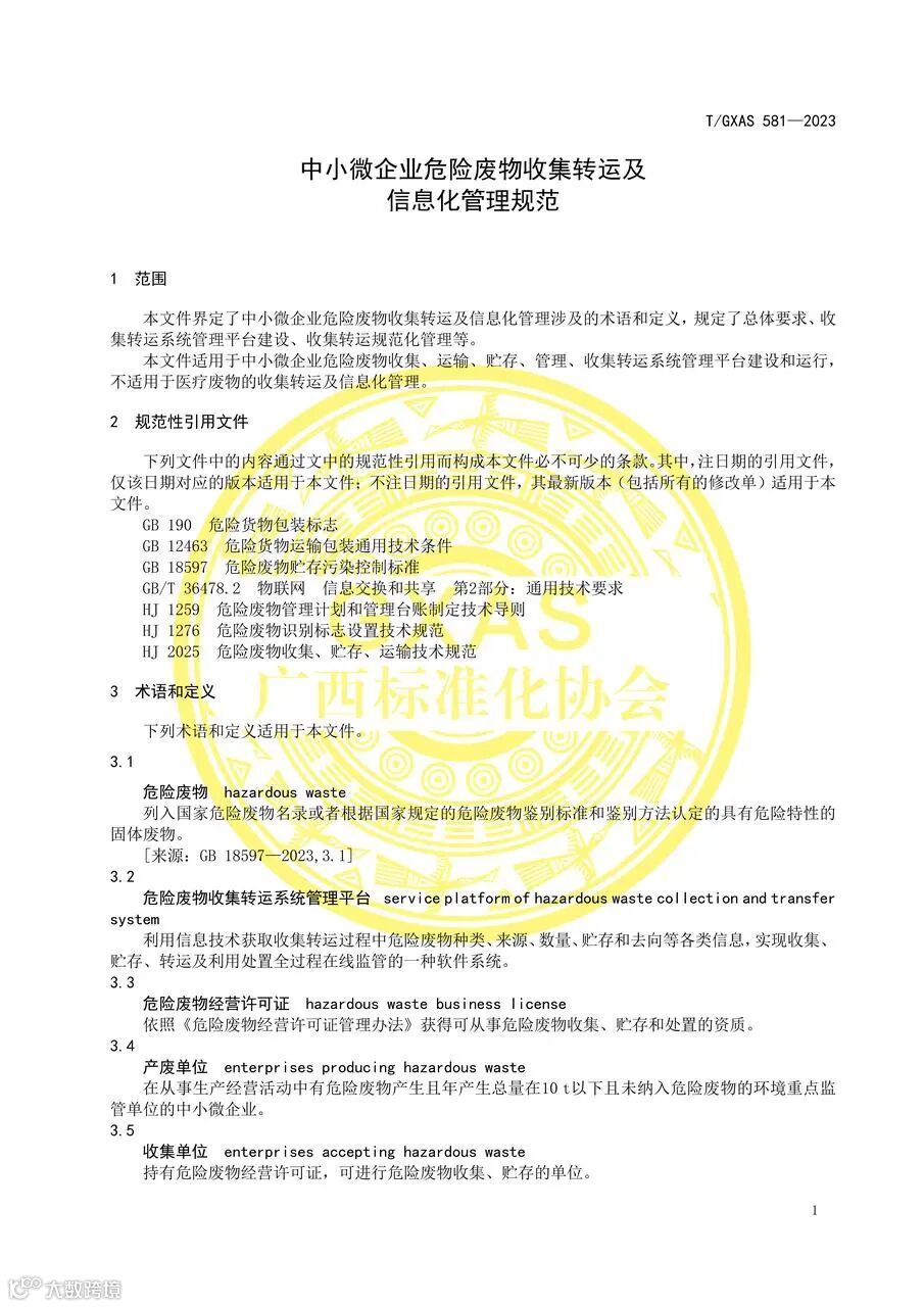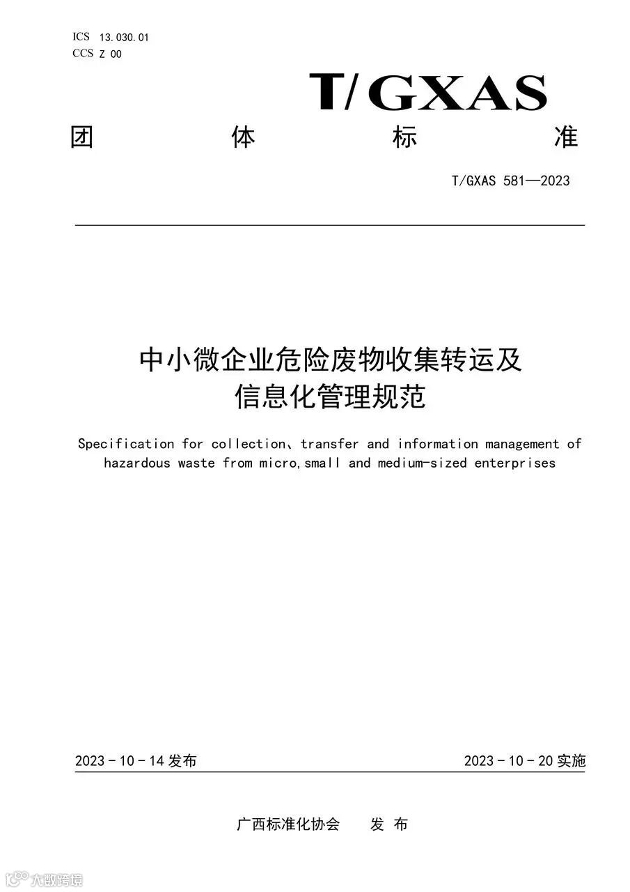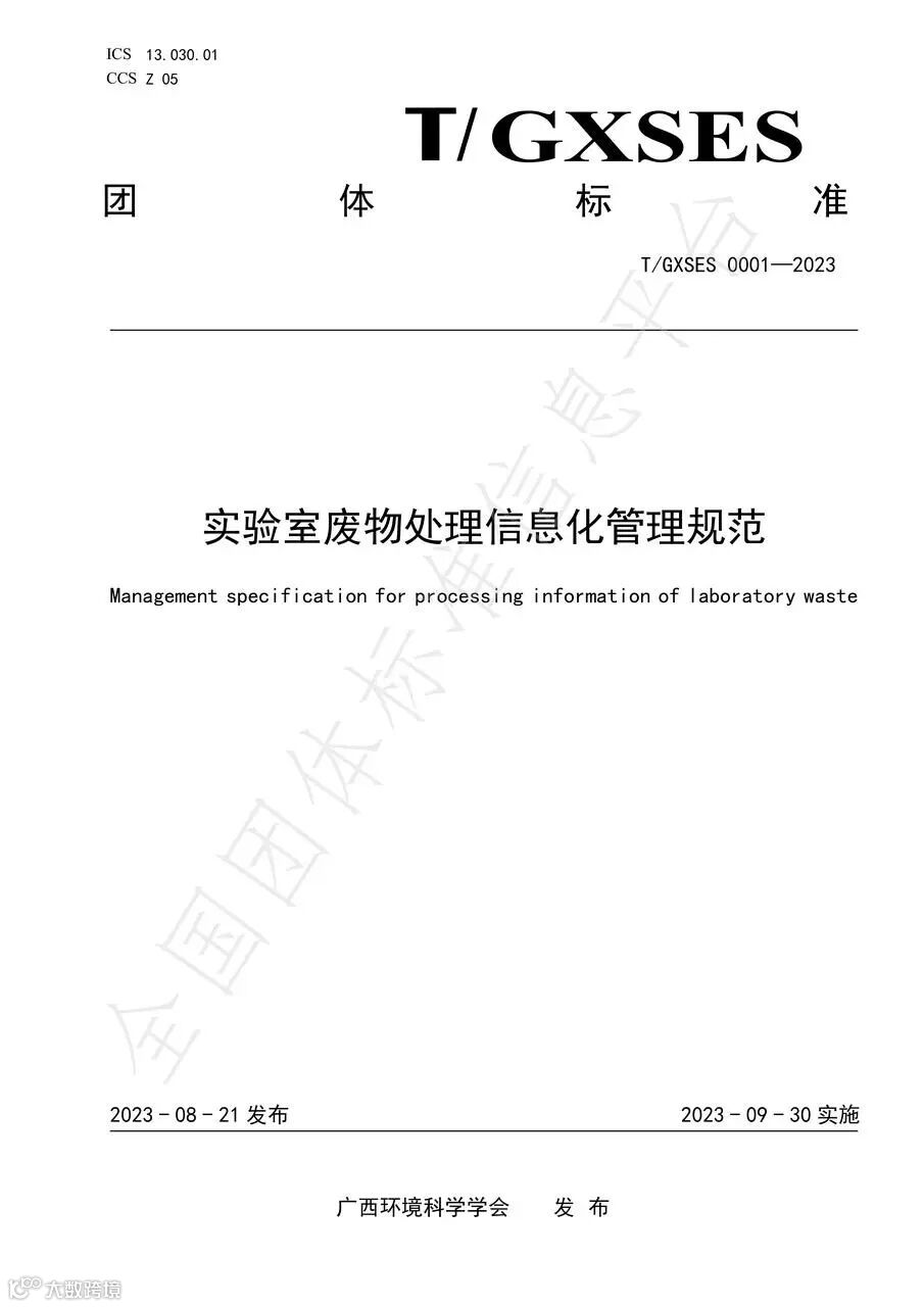 由广西泰之星信息科技有限公司(以下简称泰之星)提出并主导编制的《实验室废物处理信息化管理规范》(T/GXSES 0001—2023)、《危险废物全流程监控与信息化管理规范》(T/GXSES 0002—2023)和《中小微企业危险废物收集转运及信息化管理规范》(T/GXSES 581—2023)三项团体标准通过前期调研、立项、起草、广泛征求行业意见,请专家组进行评审论证,2023年8月21日已全部正式发布并实施。