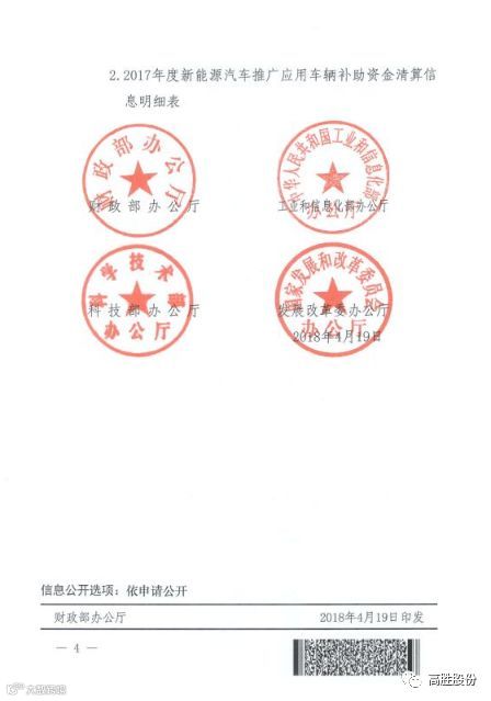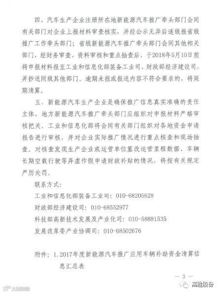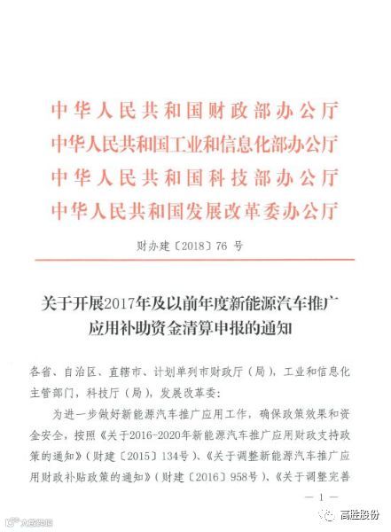 4月19日,财政部、工信部、科技部、发改委发布《关于开展2017年及以前年度新能源汽车推广应用补助资金清算申报的通知》,通知要求各地方部门提交本地汽车生产企业2017年度(行驶证注册日期为2017年1月1日至12月31日)中央财政补助资金清算申请报告。