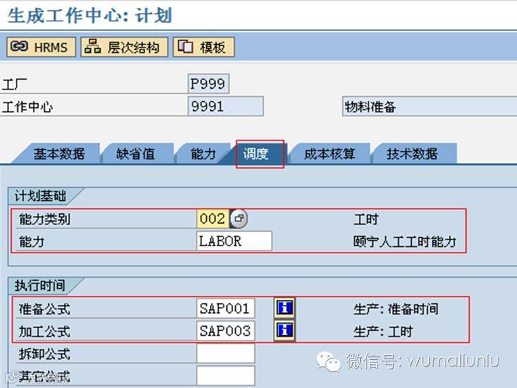 准备公式: SAP001(指该工作中心中生产订单排程时准备时间的计算公式是怎样的.