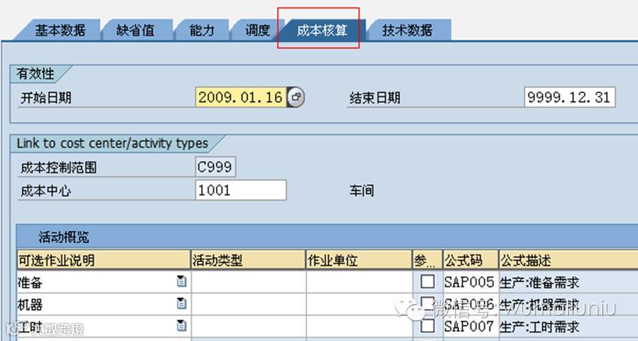成本中心: 1001(指该工作中心隶属于哪个成本中心)。1001 是指“车间”