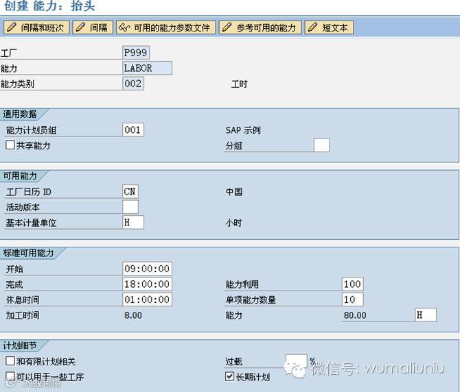 在这个步骤中(CR11)统一核算整个工厂的人工工时能力,在后面的步骤中,当新建人工工时类别的工作中心时,将通用的人工工时能力分配给他们。