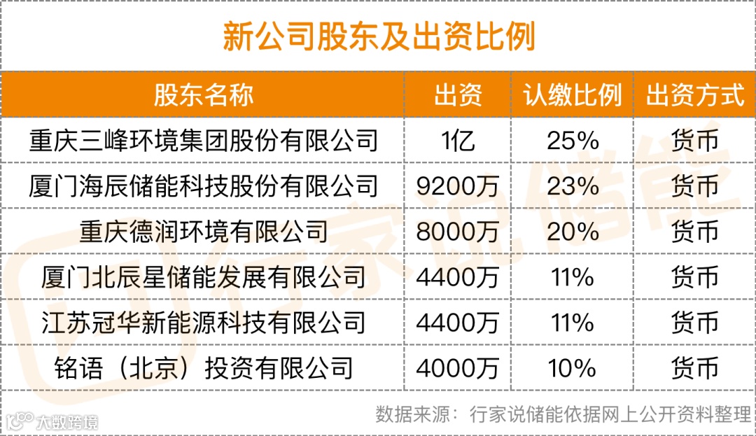 按照公告显示,此次联合企业分别为:三峰环境、控股股东德润环境、合作方海辰储能、北辰星储能、冠华新能源、铭语投资,分别持股:25%、20%、23%、11%、11%、10%。