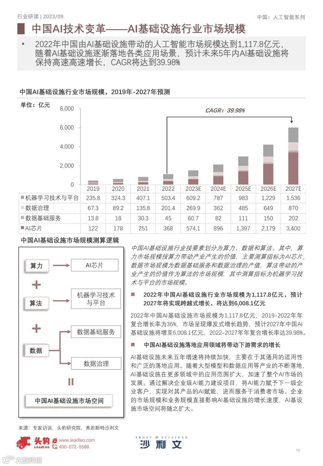 数据显示,2022年全球人工智能IT总投资规模为1288亿美元,2027年预计增至4236亿美元,五年复合增长率(CAGR)约为26.9%。IDC预计,2027年中国AI投资规模有望达到381亿美元,全球占比约9%。