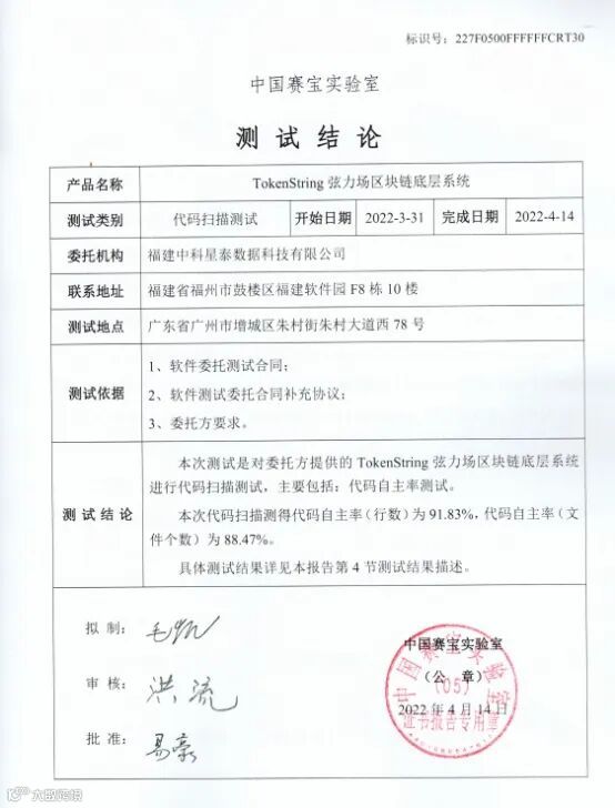 中科星泰自研国产区块链底层系统TokenString经过数年的潜心钻研,实现了代码的自主性研发,并于近日成功通过工信部电子第五研究所(中国赛宝实验室)的自主代码率评测。