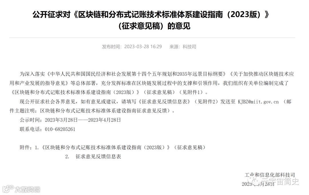 近日,工业和信息化部科技司组织有关单位编制完成了《区块链和分布式记账技术标准体系建设指南(2023版)》(征求意见稿),并于2023年3月28日至4月28日公开征求社会各界意见。