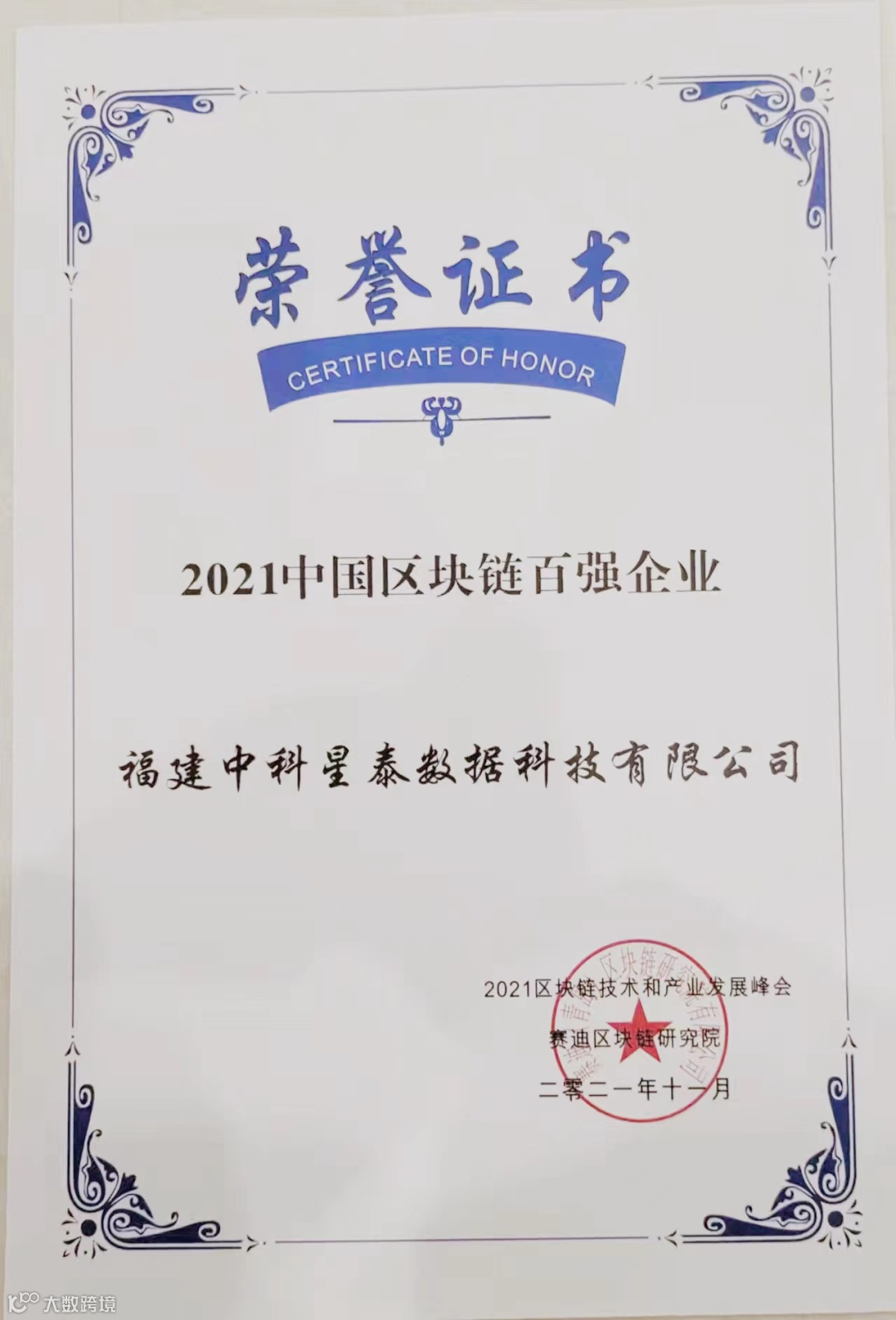 会上,工信部赛迪区块链研究院发布了《2021中国区块链百强企业名录》,福建中科星泰数据科技有限公司凭借优秀的区块链技术创新能力和丰富的落地应用案例在脱颖而出,入选”2021中国区块链百强企业“。中科星泰董事长魏良峰先生代表企业上台领奖。