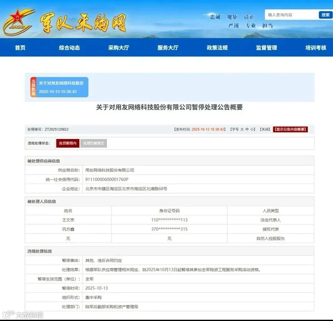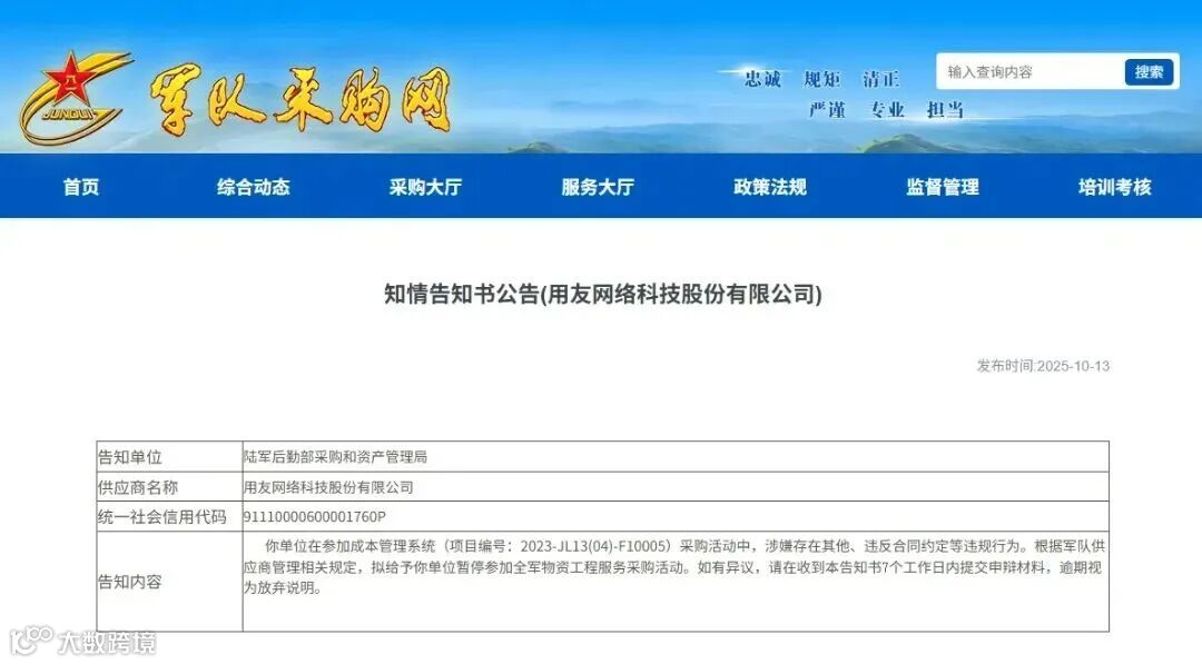 导读:根据公告,陆军后勤部采购和资产管理局,根据军队供应商管理相关规定,自2025年10月13日起暂停了用友网络参加