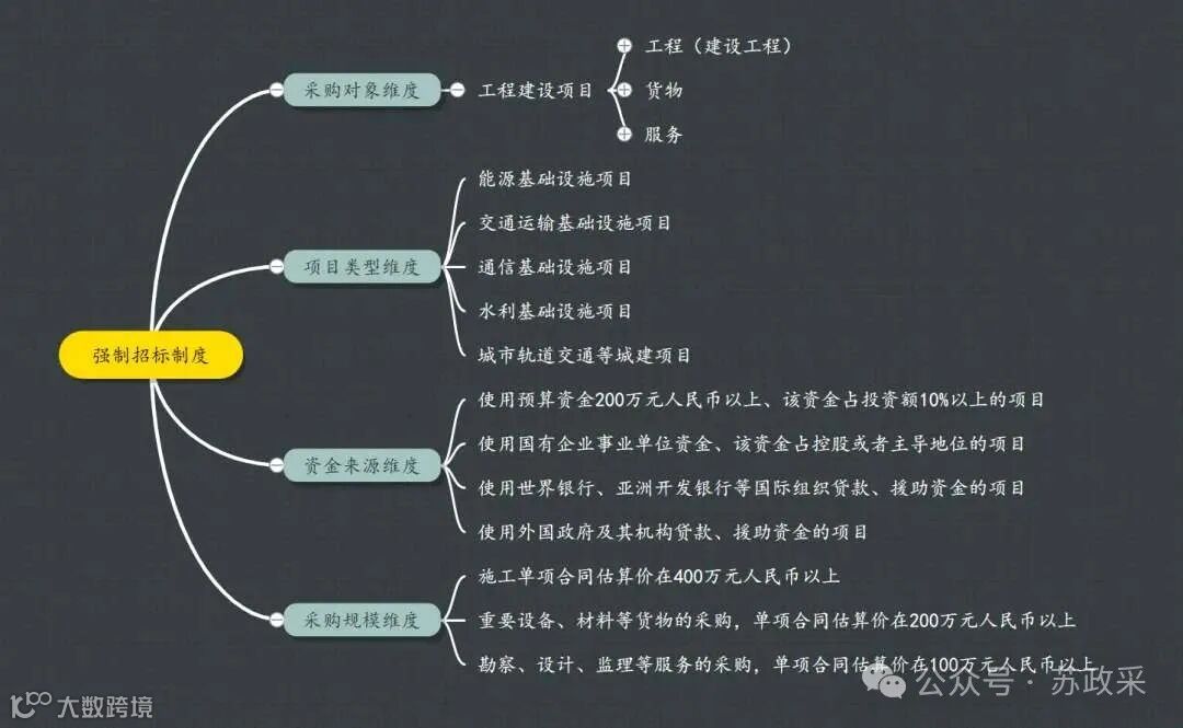 由于招标采购可以使众多投标人参与公平竞争,促使招标人以最低或较低的价格获得最优的货物、工程或服务,保障合理、有效使用国有资金和其他公共资金,提高经济效益和社会效益,因此在法律规定范围内的某些类型的采购项目,或达到一定规模的采购项目,必须通过招标的方式进行采购。强制招标制度的相关法律规定主要有《招标投标法》、《招标投标法实施条例》、《必须招标的工程项目规定》、《必须招标的基础设施和公共事业项目范围规定》等。上述规定从采购对象、项目类型、资金来源、采购规模等维度划定了强制招标采购的适用范围。