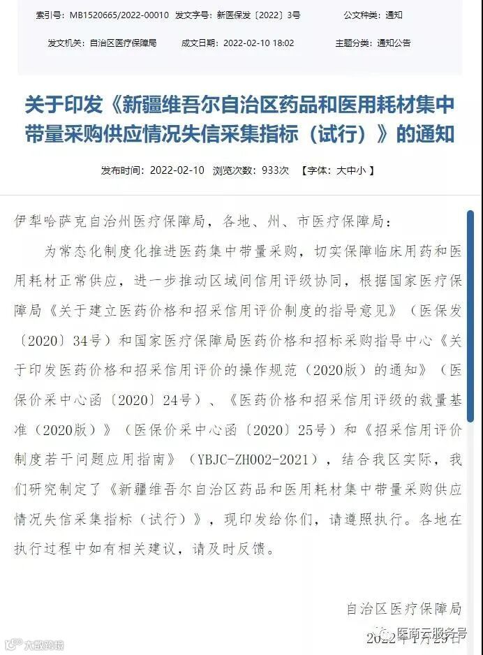 2月10日,新疆维吾尔自治区医疗保障局发布关于印发《新疆维吾尔自治区药品和医用耗材集中带量采购供应情况失信采集指标(试行)》的通知(以下简称通知)。