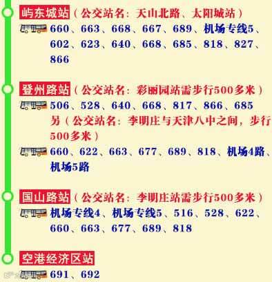 东丽开发区站(津塘路上,轻轨站西侧):东丽8、便民9、客运16线、便民77、天环-塘沽专线、185、503,605,613,621,680,835