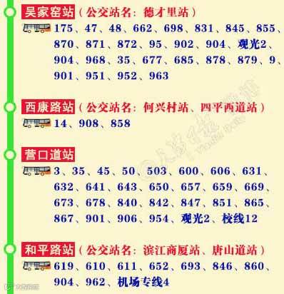 洋货市场站(河北路上,轻轨站东南侧):客运16线、便民77、天环-塘沽专线、103,108,109,110,132,133,134,501,502,503,507,605,651,680,820,825,834,835,880,936