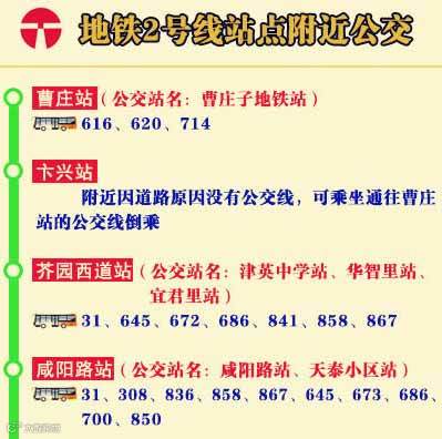 二号桥站(津塘路上,轻轨站东侧):便民9、便民77、17,30,185,503,605,613,621,679,680,806,830,835,840,856,857,860,872