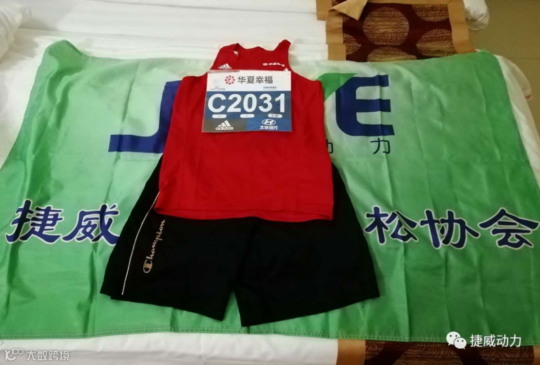 参赛的前一天,于学宁小心翼翼地展开捷威马拉松协会的会旗,将自己参赛号码布标及运动衣铺在上面,他在朋友圈说到,北马的定妆照,希望明天跑个好成绩,希望北马的运气也能延续!