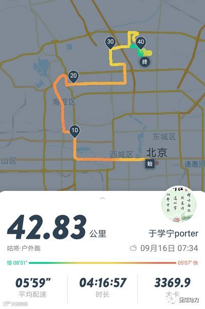 最终,在9月16日的北京马拉松赛中,身披捷威马拉松协会会旗的于学宁取得了4小时16分的好成绩,用他自己的话说,虽然未能超越上次参加北马4小时6分的成绩,但自己也很满足,过了25公里的时候,香蕉西瓜圣女果尽情吃,啤酒饮料矿泉水尽情喝。官方和民众的热情让人不由自主地放慢了节奏,享受呐喊,享受比赛的乐趣也很重要!