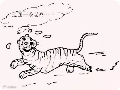有一次,一只倒霉的老虎出来觅食,一不小心踏上了这个捕兽工具,老虎怎么也挣不脱。老虎知道被猎人捉住就会身首异处,怎么办?难道为了这几寸的小小的足掌让这长达七尺的身躯受难?不行,还是逃命要紧。老虎发起怒来,拼命地蹦跳腾跃,挣断了钳住的足掌,终于逃跑了。