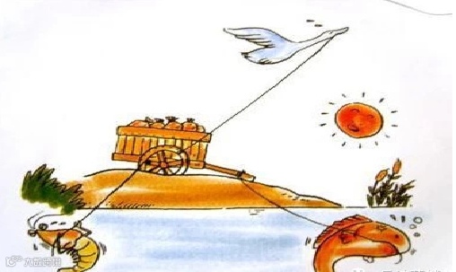 梭子鱼、虾和天鹅三个不知什么时候成了好朋友,一天,他们同时发现一辆车,车上有许多好吃的东西于是就想把车子从路上拖下来,三个家伙一齐负起沉重的担子,他们铆足了狠劲,身上青筋暴露,使出了全身的力气,可是,无论他们怎样拖呀、拉呀、推呀,小车还是老地方,一步也动不了。原来,天鹅使劲往天上提,虾一步步向后倒拖,梭子鱼又朝着池塘拉去,究竟谁对谁错?反正,他们都使劲了。