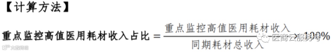 如《三级公立医院手册》要求,考核年度医院重点监控高值医用耗材收入占同期耗材总收入比例,计算方法如下: