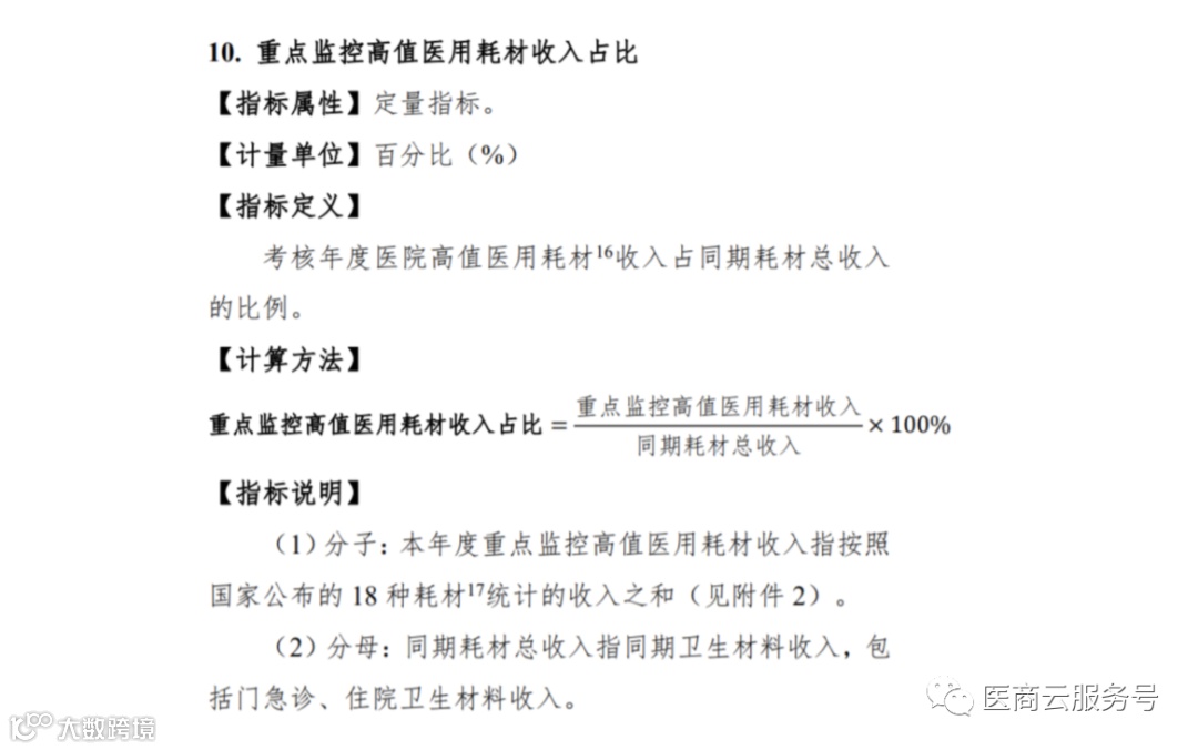 其中分子是在本考核年度,重点监控高值医用耗材收入指第一批国家高值医用耗材重点治理清单公布的 18 种医用耗材的收入。