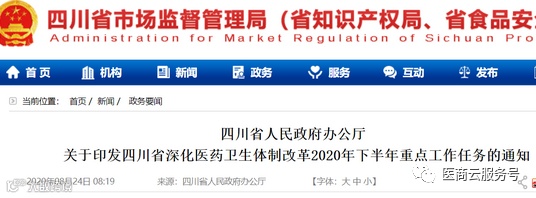 医药网8月26日讯 8月24日,根据四川省市场监督管理总局消息,四川省人民政府办公厅印发《四川省深化医药卫生体制改革2020年下半年重点工作任务》(下称《工作任务》)。