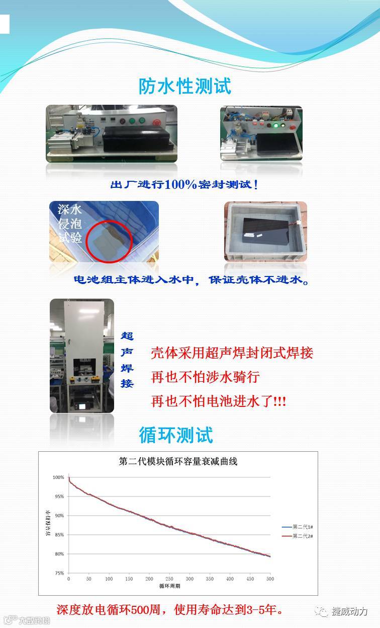 2016年,捷威在电动自行车专用锂离子电池上加大研发力度,开发出性能优异的二代电动自行车专用锂离子电池产品(48V13Ah),该产品在同类产品中尺寸最小、能量密度最高,可满足绝大多数电动自行车装配需求。骑行里程更长(夏季55km以上,冬季45km以上),安全可靠性更高,并具防水功能。尤其是低温放电能量高,零下20度放电能量在85%以上,可满足用户冬季骑行需求。