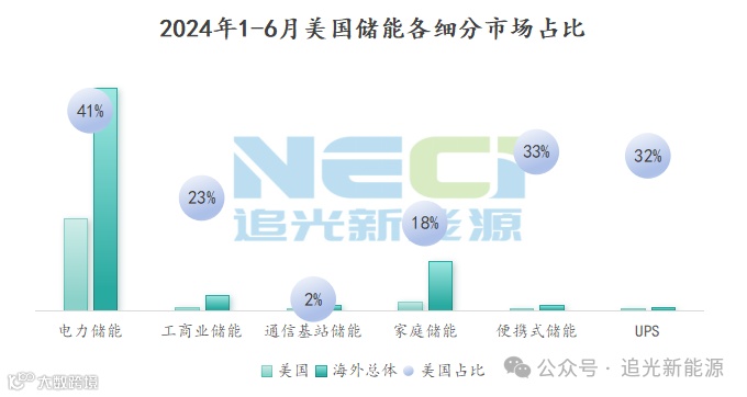 而从细分市场来看,美国储能市场超过80%的需求来自于电力储能,同时美国的电力储能需求占据了海外41%的市场份额。