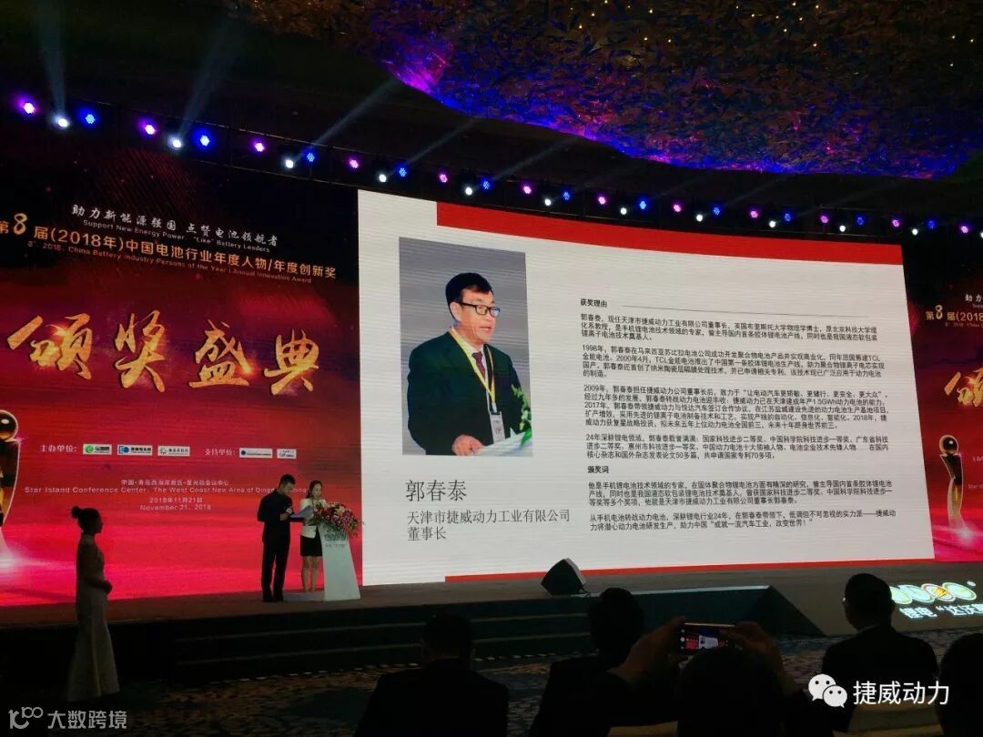11月21-23日,一年一度的全球电池行业盛会——第6届中国(青岛)锂电新能源产业国际高峰论坛(ABEC 2018,锂电"达沃斯")在中国·青岛西海岸新区·星光岛会议中心隆重举行。天津市捷威动力工业有限公司董事长郭春泰获得“中国电池行业年度人物”殊荣。