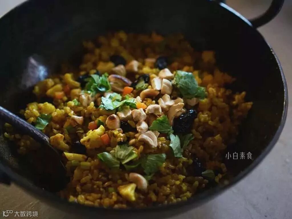 食材:杂谷150g、绿豆30g、胡萝卜40g(半根)、香芹40g、菜花100g、葡萄干40g、腰果20g、生姜、姜黄粉1小匙、油1大匙、印度咖喱粉1.5小匙、盐1小匙