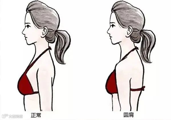 圆肩俗称“含胸”,就是两肩向前靠拢,从头顶往下看,身体呈半圆状。属于一种肌肉不平衡的情况,含胸后为了保持平衡,还会同时造成头前倾。