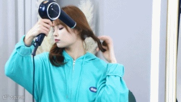 Step2:把头发吹到七八成干后,将头发分成两束一边吹一边从前往后绕。