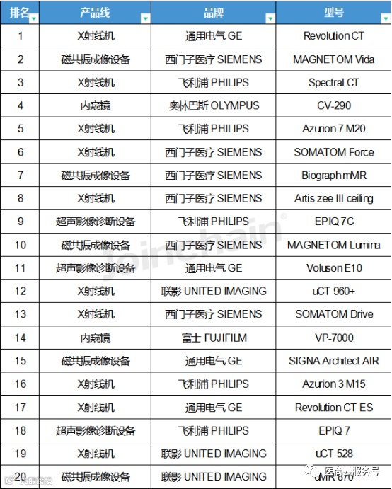 西门子医疗、飞利浦、通用电气GE等跨国医疗器械巨头仍在市场中占据主导地位。从型号来看,销售额排在第一位的是通用电气 GE型号为Revolution CT的X射线机;其次是西门子医疗 SIEMENS型号为MAGNETOM Vida的磁共振成像设备;排名第三的是飞利浦 PHILIPS型号为Spectral CT的X射线机。