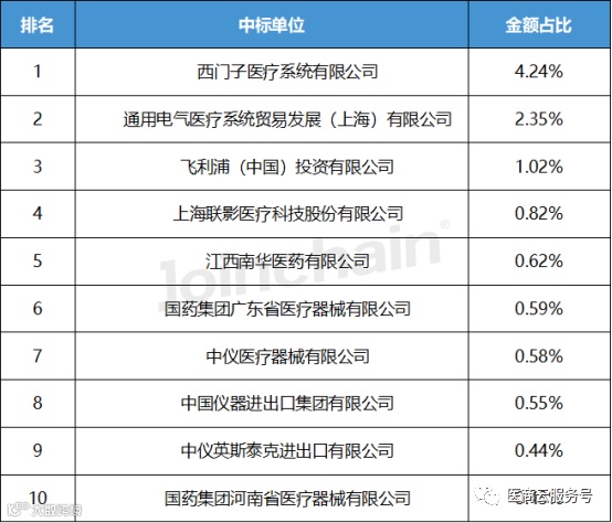 根据中标单位来看,排在榜首的是西门子医疗系统有限公司,中标金额占比为4.24%;排名二的是通用电气医疗系统贸易发展(上海)有限公司,排名第三的是飞利浦(中国)投资有限公司。