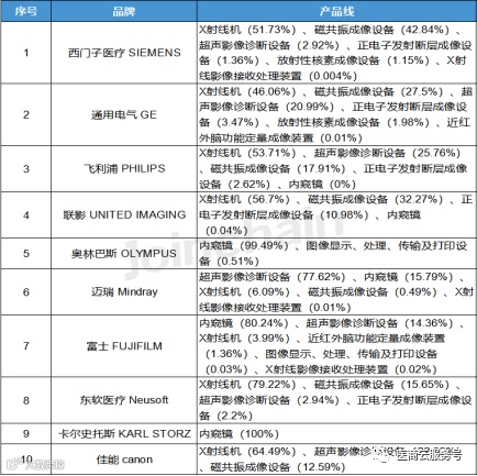 表1 2023年上半年医用成像器械品牌与主要产品线名称(Top10)