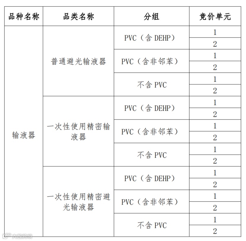 分组方面,输液器按照产品类型及材质进行分组,采购需求量排名前6名的企业进入竞价单元1,除竞价单元1的企业外,采购需求量涵盖的其余企业进入竞价单元2。如竞价单元2的企业家数不足3家,则直接并入竞价单元1,该分组不再划分竞价单元。