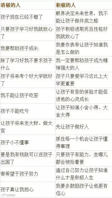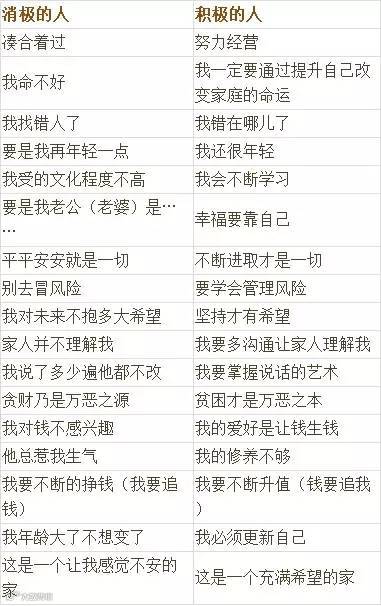思维决定命运,思维决定心态,思维决定教育方式,思维影响孩子的前途。一个人在原生家庭中继承和熏陶的最重要的是思维方式。积极思维的人容易培育出积极思维的孩子,消极思维的人,容易造就消极思维的孩子。下面我们就来看看消极的人和积极的人他们的思维方式有何不同?